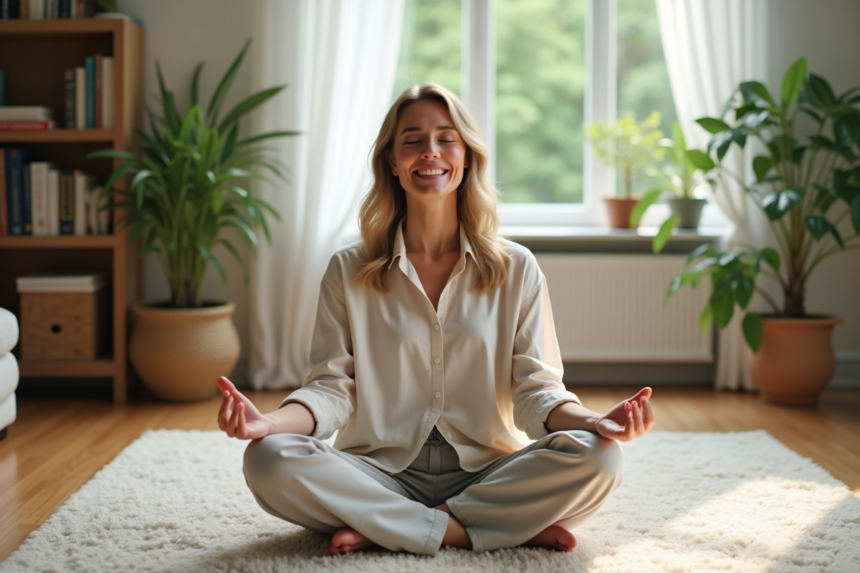 Femme sereine pratiquant la pleine conscience chez elle